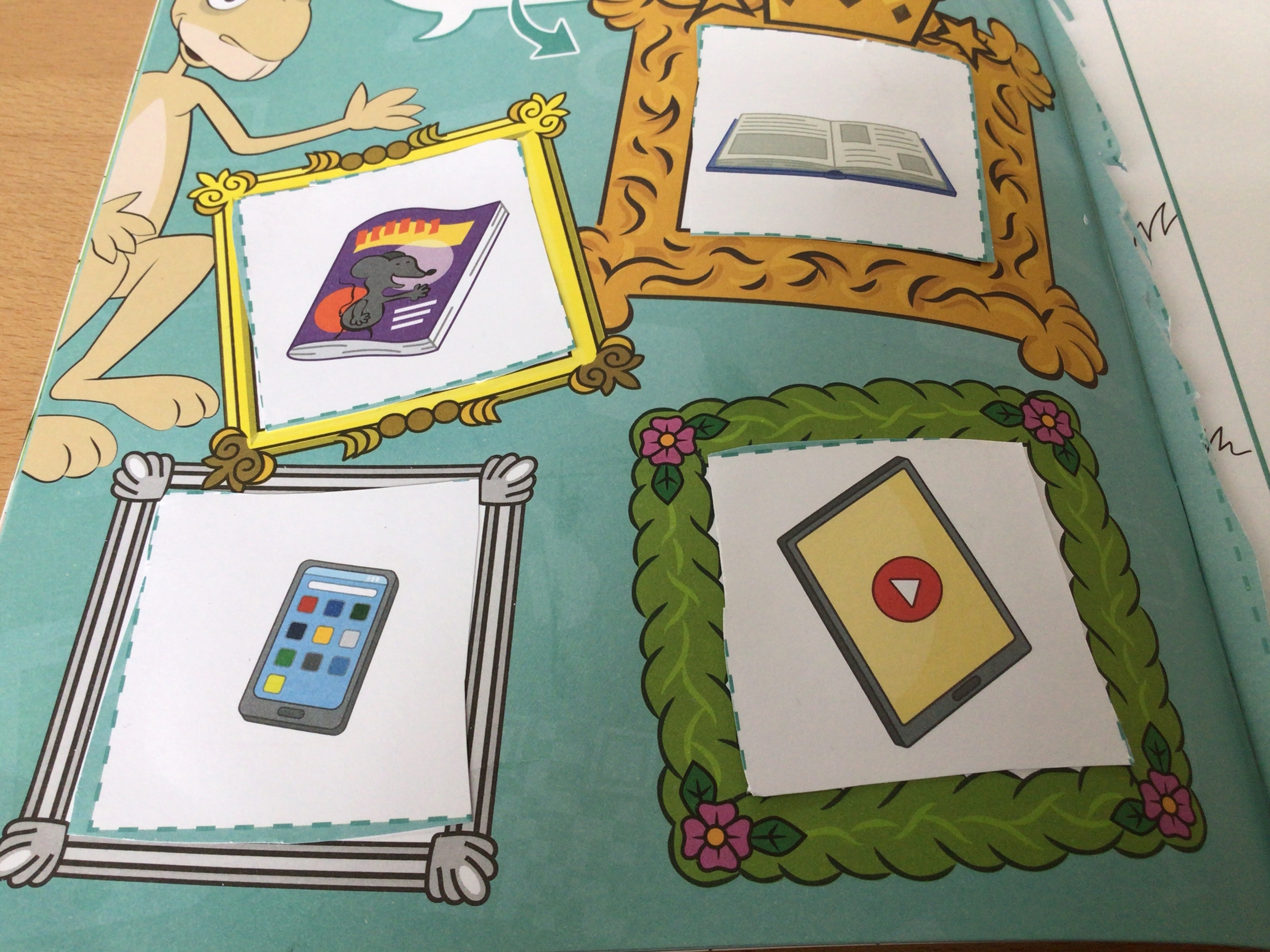 • Suche dir aus den Bildern auf Seite 9 deine Lieblingsmedien aus und klebe sie auf Seite 8.