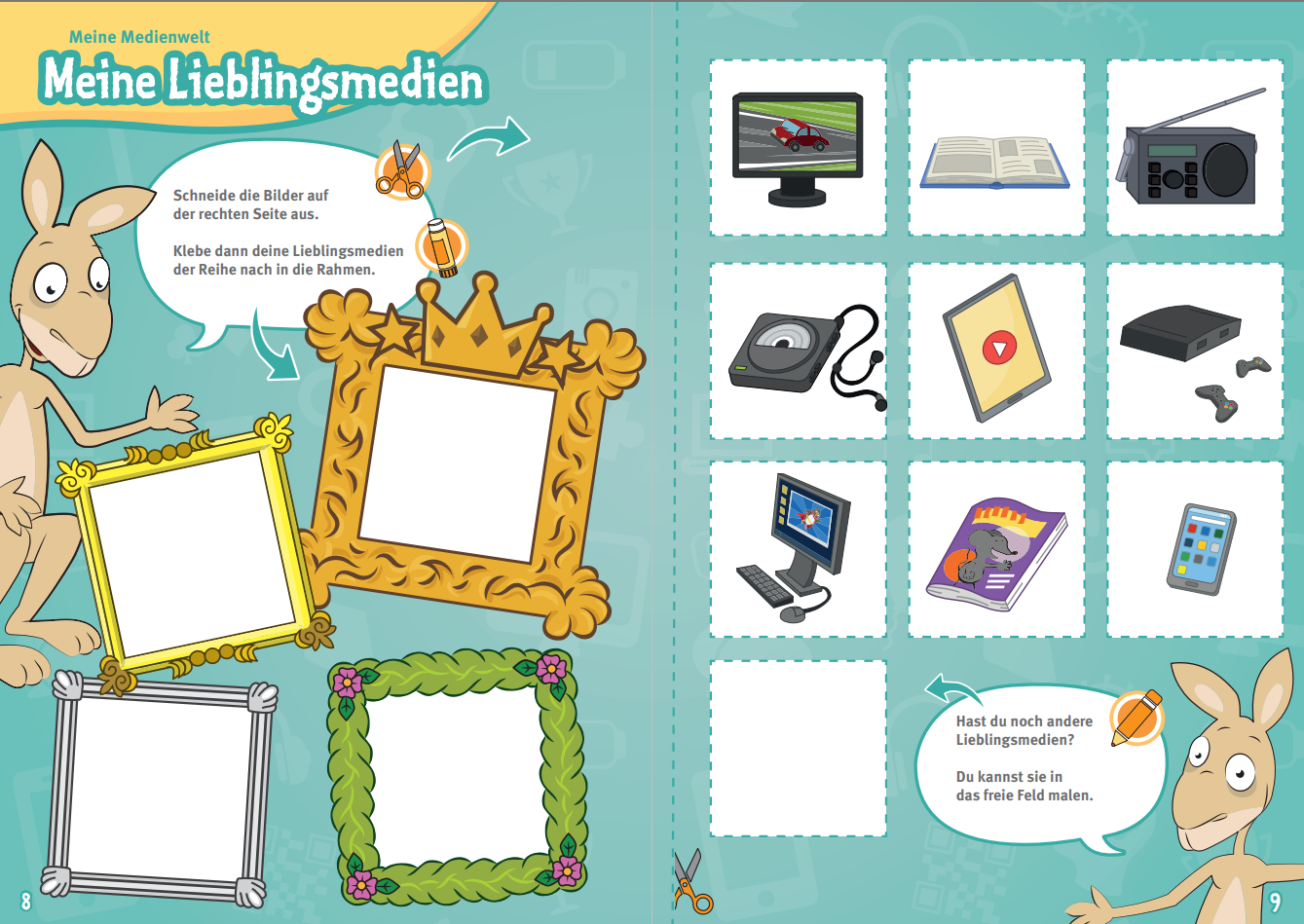 - Suche dir aus den Bildern auf Seite 9 deine Lieblingsmedien aus und klebe sie auf Seite 8.
